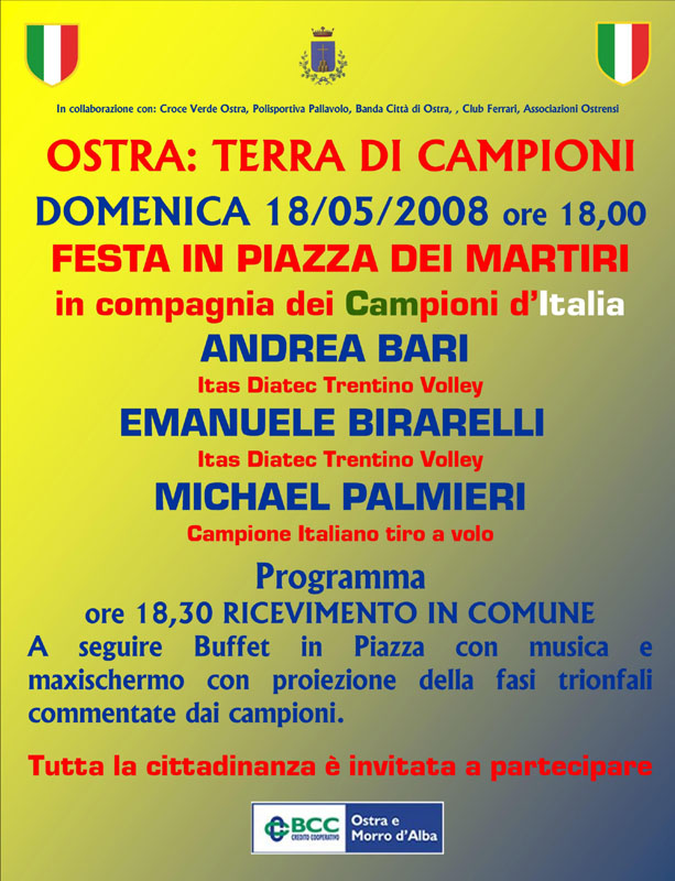 Per rendere onore ai tre giovani campioni, il Comune di Ostra, in collaborazione con alcune Associazioni sportive del territorio, in particolare con la Polisportiva ostrense che ha forgiato i due pallavolisti, sta predisponendo una festosa manifestazione che prenderà avvio alle 18,00 e continuerà per buona parte della notte.