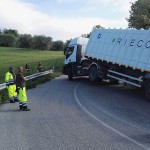 Un grosso articolato della ditta che si occupa della raccolta dei rifiuti, la Rieco, è uscito di strada finendo col rimorchio nella scarpata ai lati della strada.