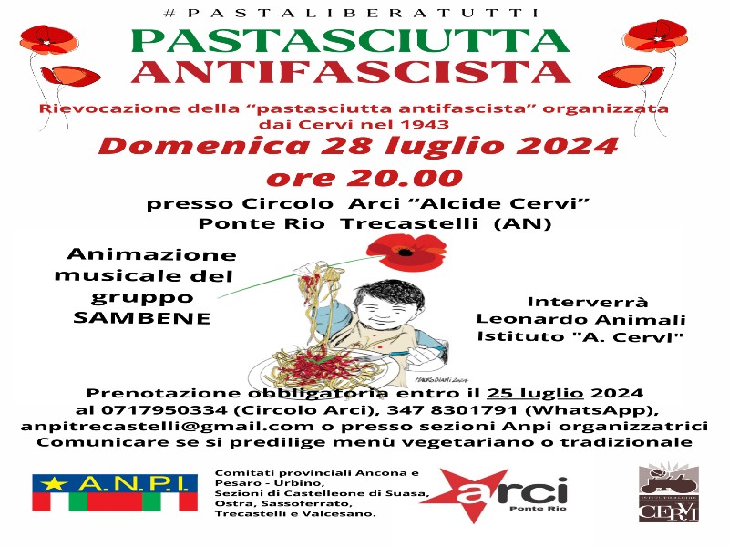 Alla ricerca della memoria e dei valori che hanno ispirato la Resistenza, le sezioni Anpi di Castelleone di Suasa, Ostra, Sassoferrato, Trecastelli e Valcesano in collaborazione con i comitati provinciali Anpi della provincia di Ancona e di Pesaro-Urbino e il circolo Arci di Ponte Rio, si preparano a riproporre la tradizionale pastasciutta antifascista.