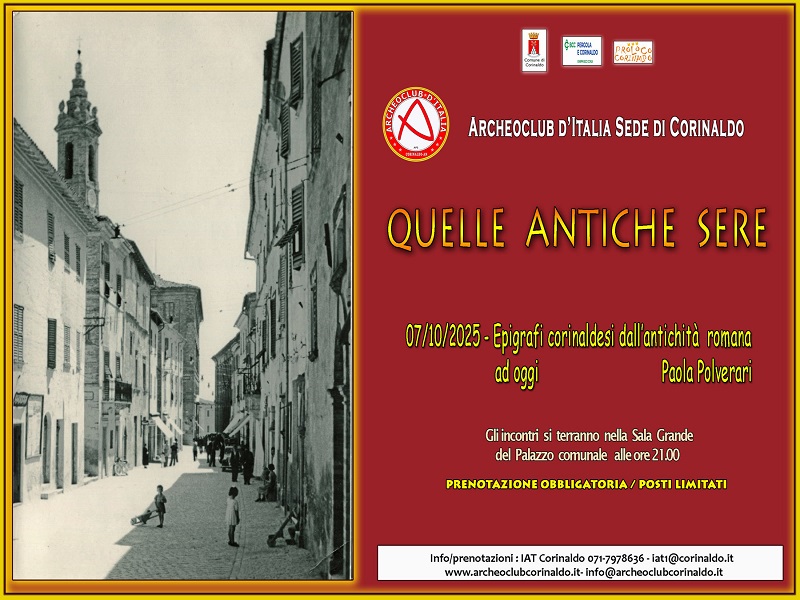Martedì 7 ottobre 2025 alle ore 21.00, presso la Sala Consiliare del Comune di Corinaldo, si terrà il terzo incontro della Rassegna QUELLE ANTICHE SERE organizzata dall’Archeoclub di Corinaldo. L’intervento, dal titolo Epigrafi corinaldesi dall’antichità romana ad oggi, sarà a cura di Paola Polverari.