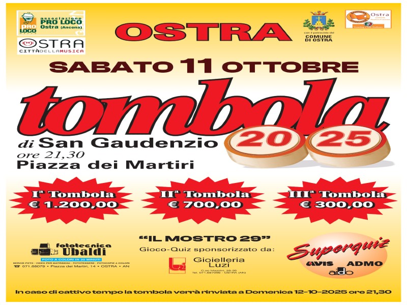 Nella serata di sabato 11 ottobre dunque, alle ore 21,30 in Piazza dei Martiri, torna la tradizionale tombola, con il patrocinio del Comune di Ostra e con un montepremi complessivo di € 2.200 suddiviso in tre vincite da € 1.200, € 700 ed € 300.