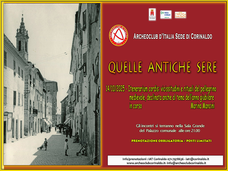 Martedì 14 ottobre ultimo appuntamento della rassegna organizzata dall’Archeoclub di Corinaldo denominata “Quelle antiche sere”. A chiudere il ciclo di incontri sarà Marina Mancini che parlerà di Itinerarium cordis: vicissitudini e rituali del pellegrino medievale, declinata anche al tema del anno giubilare in corso.