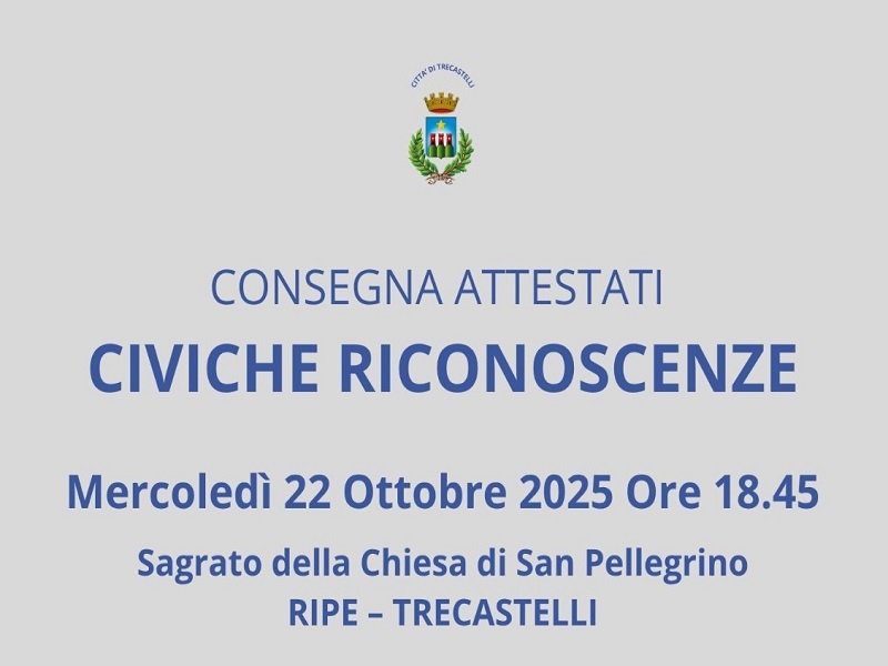 Mercoledì 22 ottobre 2025, alle ore 18.45, sul sagrato della Chiesa di San Pellegrino a Ripe di Trecastelli, prima della Santa Messa dedicata al Patrono San Giovanni Paolo II, si terrà la cerimonia di consegna degli Attestati di Civica Riconoscenza a tre cittadini, come segno di gratitudine per il prezioso contributo offerto nel corso degli anni alla comunità.
