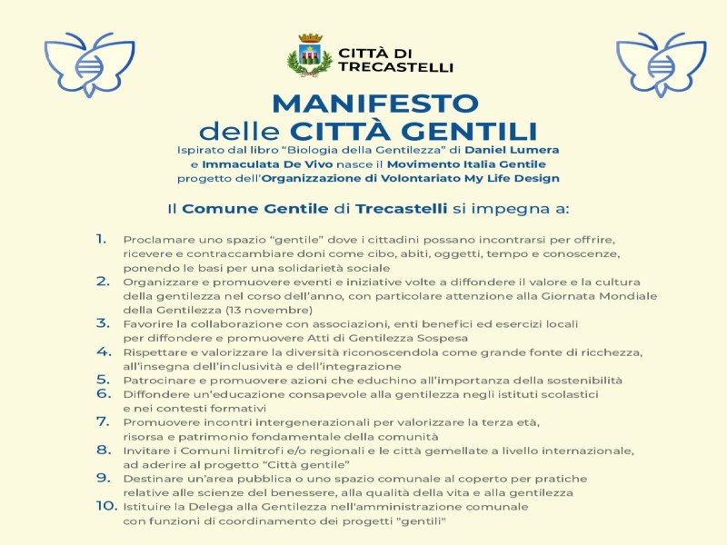 Giovedì 13 novembre 2025 Città di Trecastelli, che nel marzo 2024 è stata proclamata Città Gentile con la sottoscrizione del Manifesto delle Città Gentili della Lumera odv di Daniel Lumera, celebra la Giornata Mondiale della Gentilezza con l’apertura di due pagine Social dedicate alla Gentilezza.
