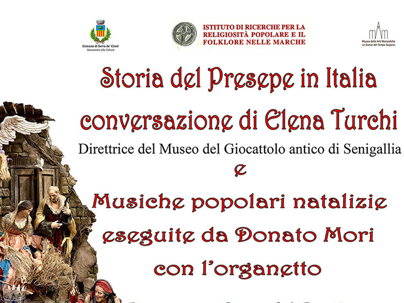 Venerdì 5 dicembre ore 21:15 a Serra de’ Conti nella Sala Multimediale del Museo delle Arti Monastiche la dott.ssa Elena Turchi (studiosa e direttrice del Museo del Giocattolo antico di Senigallia) terrà una conversazione che ripercorre la storia del presepe in Italia con proiezione di numerose immagini, alternandosi all’organetto del dott. Donato Mori (storico dell’arte e studioso di musica popolare), che suonerà musiche popolari natalizie di varie regioni italiane nate per essere eseguite davanti al presepe.