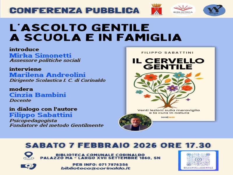 Sabato 7 febbraio 2026 alle 17.30, presso la sala riunioni della Biblioteca Comunale – Palazzo MA a Corinaldo, è in programma l’incontro L’ASCOLTO GENTILE A SCUOLA E IN FAMIGLIA, con lo psicopedagogista Filippo Sabattini.
