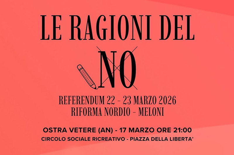Incontro a Ostra Vetere sulle ragioni del No al Referendum Giustizia 2026Al Circolo Sociale Ricreativo in Piazza della Libertà di Ostra Vetere, martedì 17 marzo 2026 alle 21, si svolgerà un’assemblea pubblica per informare tutte le cittadine e cittadini sui temi oggetto del referendum e per farsi un’opinione corretta sull’argomento e votare in modo consapevole. Come ospiti avremo l’avvocato Andrea Nobili e il laureando in giurisprudenza Giovanni Margiotta, con introduzione di Chiara Morico, Dott.ssa in Scienze Politiche, Economiche e del Governo e con la moderazione della Presidente di ANPI Senigallia, Mabel Morri. Questa riforma nominata Meloni-Nordio è il più grande, feroce attacco alla democrazia da oltre 30 anni. La democrazia non è la dittatura della maggioranza.