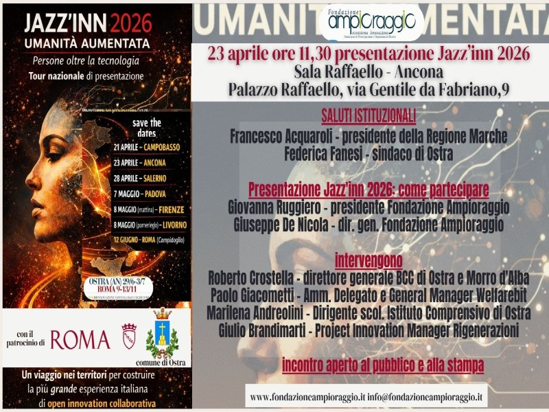 Lo scorso anno il Comune di Ostra è stato tra i case givers selezionati per l’edizione 2025: a seguito di quella esperienza e dell’Ampioraggio Day, che le è stato dedicato nel mese di novembre, quest’anno Ostra, primo comune socio della Fondazione Ampioraggio, avrà il privilegio di ospitare la tappa estiva di Jazz’INN 2026, dal 29 giugno al 3 luglio; la seconda tappa sarà a Roma, dal 9 al 13 novembre (è la prima volta che una città metropolitana partecipa a questo progetto). Ci stiamo preparando ad accogliere imprenditori e stakeholder provenienti dal nostro territorio, dalla nostra regione e da tutta Italia, per incontrarci, confrontarci, condividere progetti e “buone pratiche” e contribuire a creare un ecosistema inclusivo e collaborativo. Grazie al coinvolgimento della Fondazione “Ampioraggio” sono stati già investiti nei progetti nati dai territori oltre 90milioni di euro. Da Campobasso, che ha ospitato l’edizione 2025 di Jazz’INN, è partito il tour nazionale di presentazione dell’edizione 2026: il percorso, che attraverserà l’Italia per attivare connessioni, idee e opportunità tra territori, imprese, istituzioni e innovatori, farà sosta ad Ancona giovedì 23 aprile 2026, ospitato dalla Regione Marche a Palazzo Raffaello. Alle ore 11.30, saranno presenti il presidente della Regione Marche, Francesco Acquaroli, il Sindaco del Comune di Ostra, Federica Fanesi, la presidente della Fondazione Ampioraggio Giovanna Ruggiero e il Direttore generale Giuseppe De Nicola, che daranno approfondite informazioni sull’iniziativa e sulle modalità di partecipazione. Interverranno anche il direttore generale della BCC di Ostra e Morro d’Alba, Roberto Crostella, l’Amministratore delegato e General Manager di Welfarebit, Paolo Giacometti, la Dirigente dell’Istituto comprensivo di Ostra Marilena Andreolini, il CEO e Co-founder di Solidity 2, Giulio Brandimarti. Il tour è pensato per informare imprese e corporate interessate a innovazione e sostenibilità, pubbliche amministrazioni, start Up e PMI innovative, investitori fondi e stakeholder finanziari, Università, centri di ricerca e hub territoriali, associazioni e attori dell’innovazione. Vi invitiamo a partecipare per poter conoscere meglio e da vicino questa opportunità.