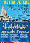 Nell’ambito della programmazione estiva “I Mille Colori dell’Estate” predisposta dall’Amministrazione comunale, c’è spazio anche per gli eventi enogastronomici di rilievo. Uno di questi, il più importante, riguarda la “Sfilata delle attrezzature agricole d’epoca”, una manifestazione organizzata dall’Associazione Pro Loco di Ostra Vetere in stretta collaborazione con l’Amministrazione comunale, che prenderà il via giovedì 27 luglio e proseguirà fino a martedì I° agosto a Pongelli nella località “Le Muracce”.