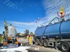 Intervengono i vigili del fuoco a Fano per mettere in sicurezza mezzo e area coinvolta